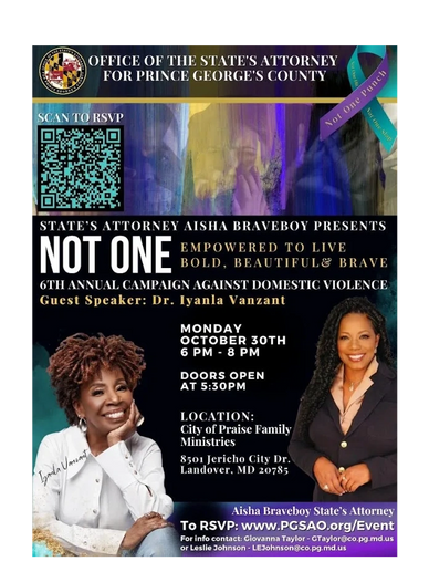 We had the pleasure of participating as a Resource for the 6th Annual "Not One: Campaign Against Domestic Violence" led by State's Attorney Aisha Braveboy and her special guest speaker Dr. Iyanla Vanzant in multiple capacities.